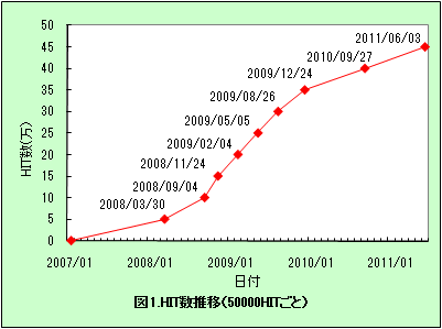 旧ブログ自体は、2005年3月28日にスタート。アクセスカウンターをつけたのは、2007年1月1日ということで、5万ヒットごとにポイントをつけて、線で結んだグラフは以下の通り。